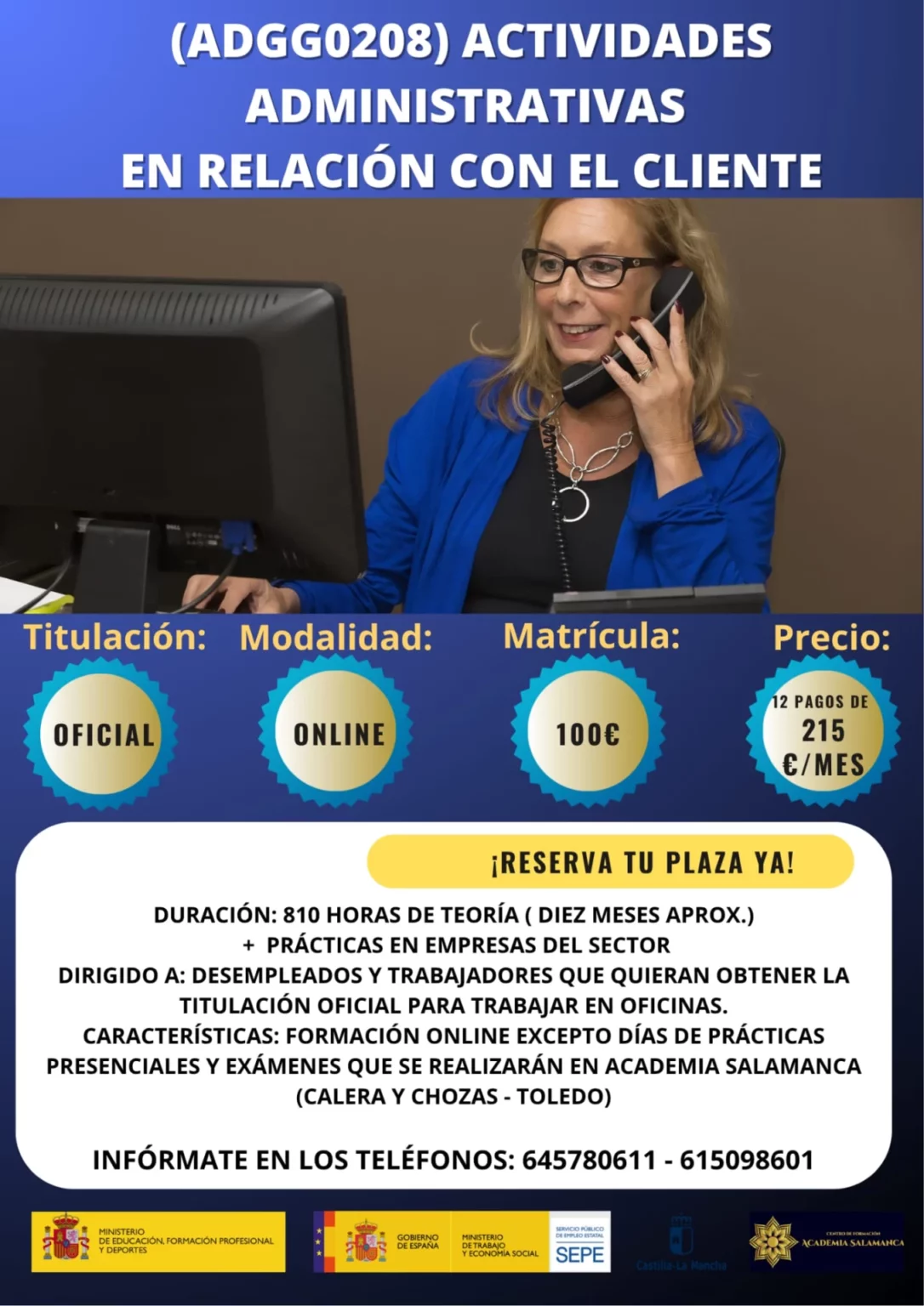 Curso oficial del SEPE orientado a la formación en tareas administrativas y atención al cliente.